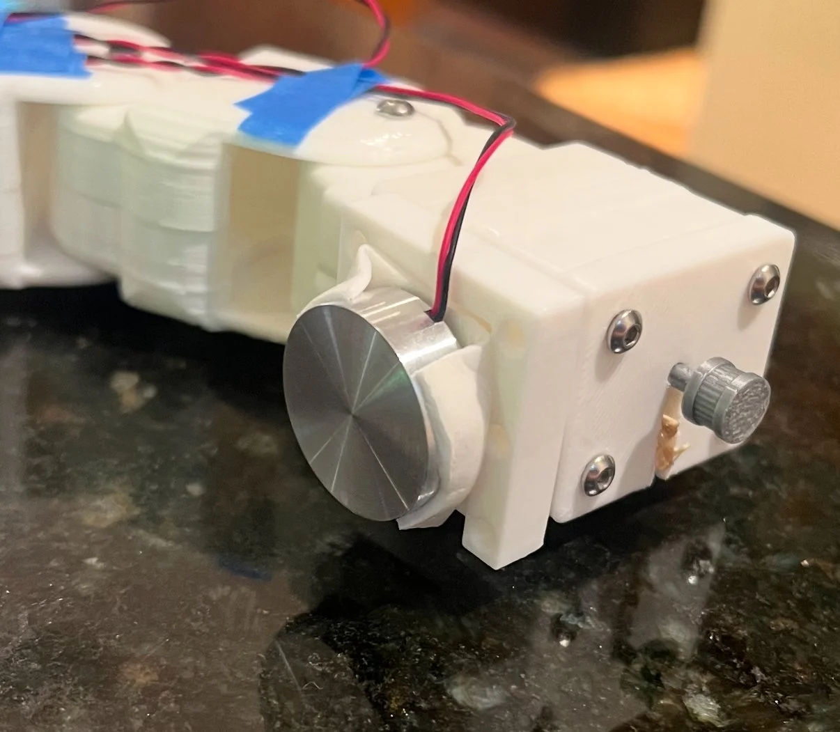 For the final design, this prototype was a tremendous overhaul of the previous two design and incorporates both concerns from the second design stage and greater improvements for manufacturing. Detailed neck links for modular neck adjustment, gear systems for a rack and pinion to engage the sensors, and multiple articulating parks for future adjustments in the design.